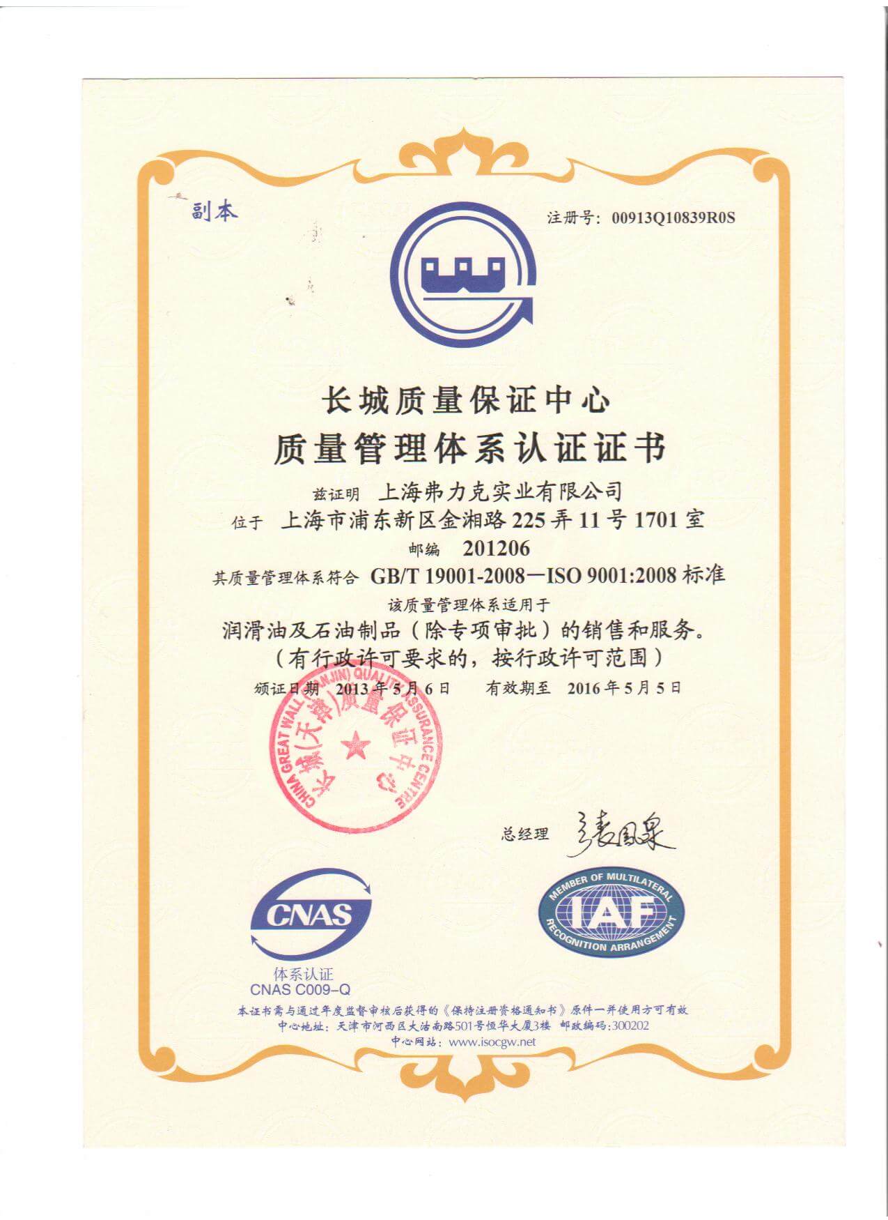 弗力克質(zhì)量管理體系認(rèn)證證書(中文)